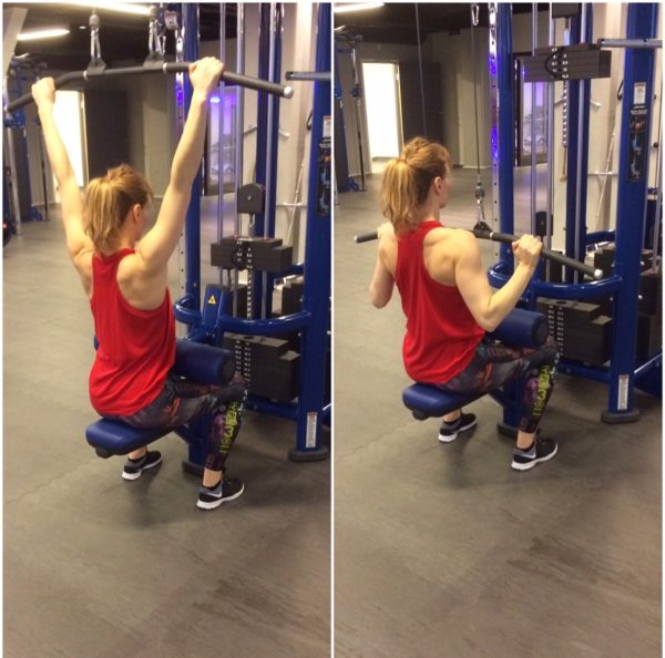 Latsdrag – tänk på att först sänka skulderbladen innan du drar ned stången. Försök att inte luta för mycket bakåt.