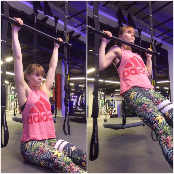 Latsdrag i TRX eller som här en stång (beroende på vad som finns i ditt gym). Det här är en riktig favorit som jag tycker ger den rätta känslan för hur du ska dra dig uppåt. Sitt på rumpan med benen rakt fram under handtagen/stången. Höj upp handtagen/stången så att armarna är raka. Dra dig sedan upp så hakan kommer över handtagen/stången. Fötterna är hela tiden kvar i golvet. Gör så många du orkar x 3 som ett exempel.