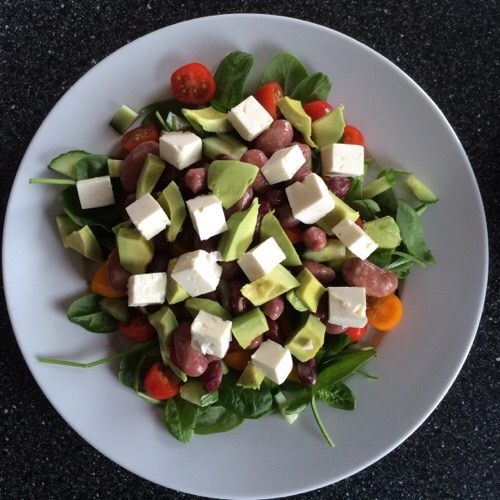 Skölj av bönorna och lägg i en skål. Häll på alla ingredienserna och rör om. Klart! Sedan gör jag en sallad av vad som finns hemma och toppar med hälften av bönorna. Mums!