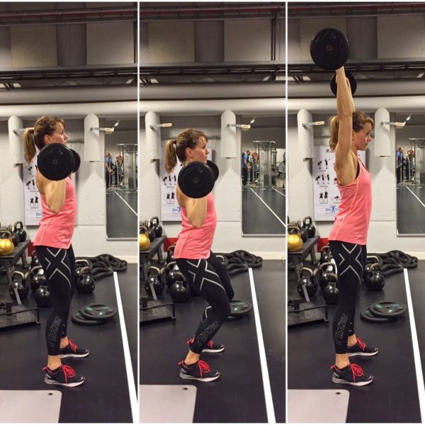 Nedan kör Lina pushpress – militärpress med lite hjälp av benen. Böj benen & pressa upp skivstången på raka armar. Vi kör lite lättare vikt & högre tempo.