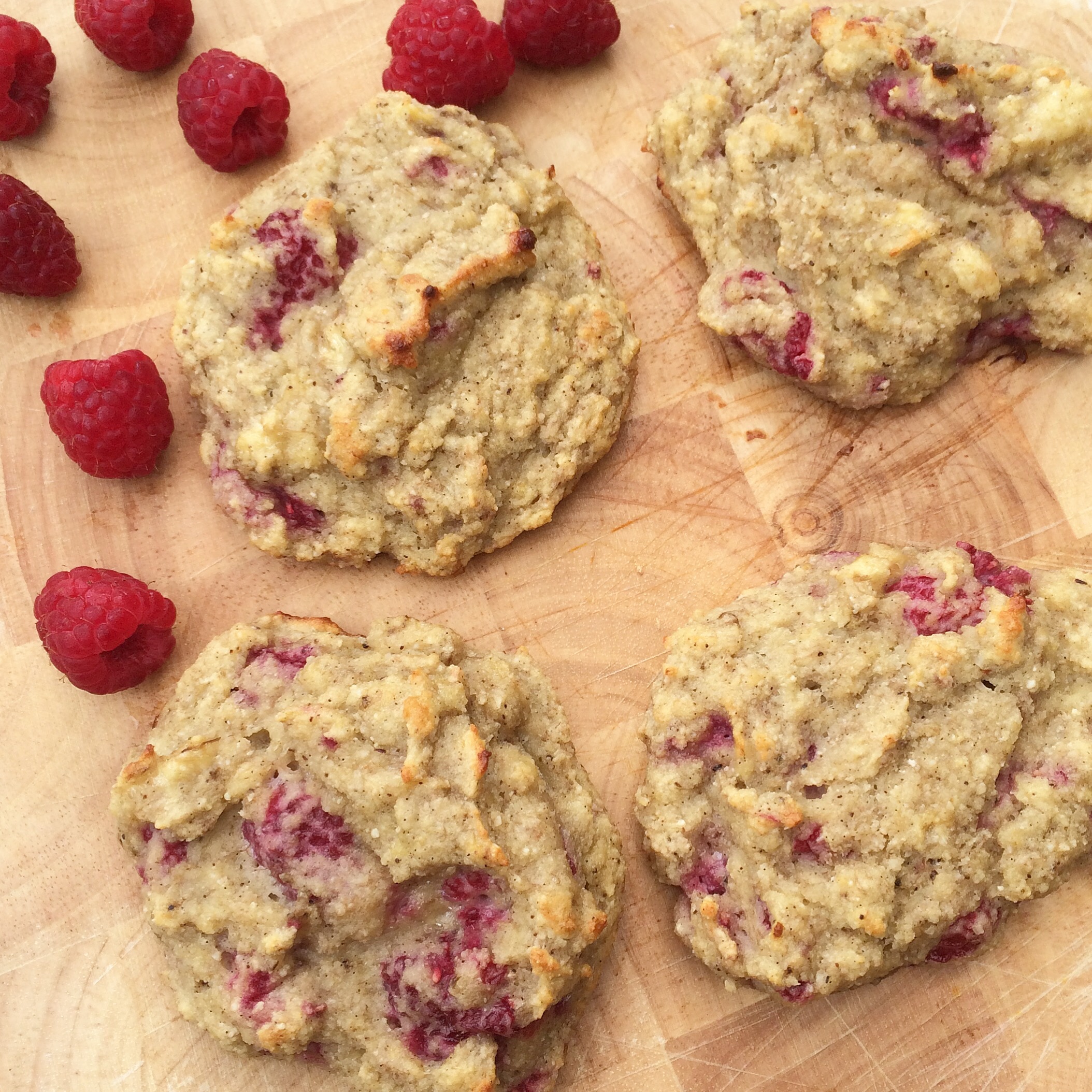 Mosa bananen. Rör i övriga ingredienser förutom hallonen. Blanda väl, det gör inget om det är lite bitar av bananerna. Vänd försiktigt i hallonen. Klicka upp 4 scones på en plåt med bakplåtspapper. In i ugnen på 200 grader i cirka 20 minuter, de ska bli lite ljust bruna uppepå. Låt stå & svalna så de stannar sig. Njut!