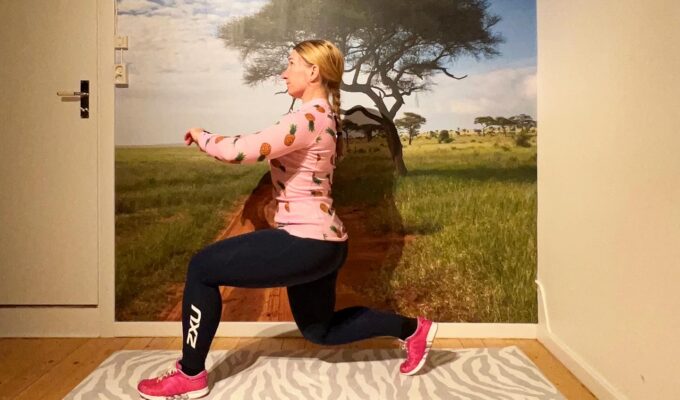 Ovan benböj och nedan armhävningar. Blir det för tungt att göra armhävningar på tårna, sätt ner knäna i golvet.