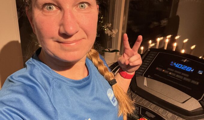 1,5 km (speed 8 på löpbandet) alternativt 10 min