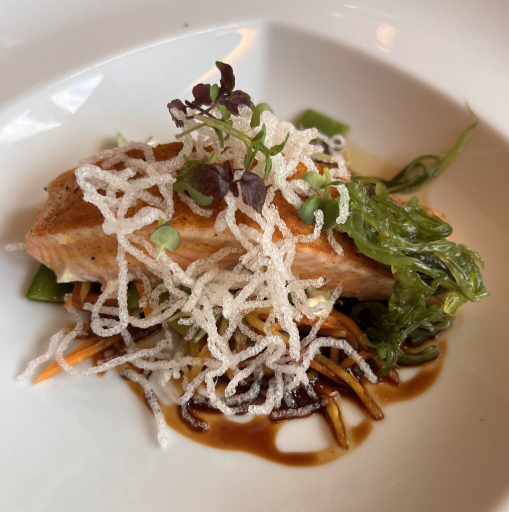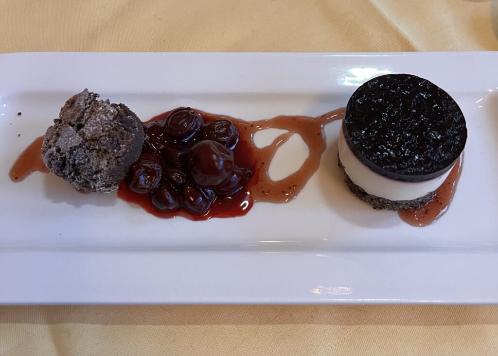 Söndagens 5-rätters bestod av Salladsbuffé, Creamy cheese soup with sunflower seeds, Salomon fillet ”Asian style” with deep-fried glass noodles, Ostbuffé samt White and dark chocolate mousse with chocolate cake and sour cherries.