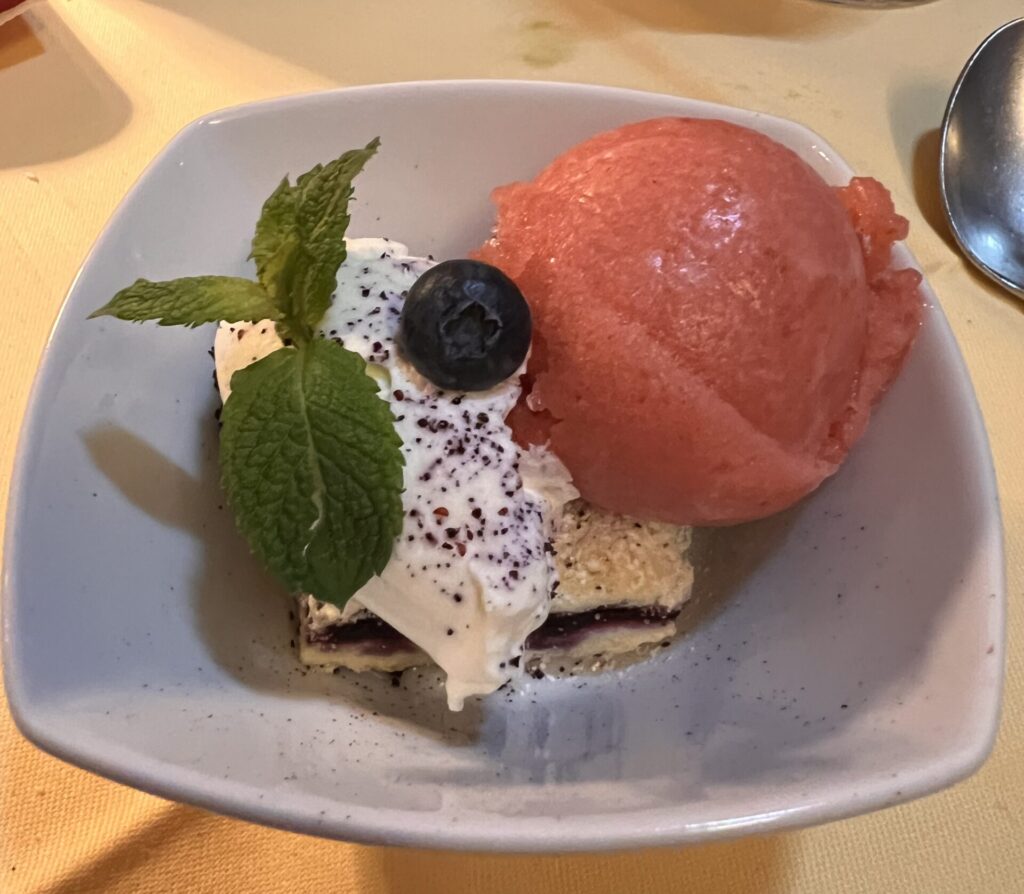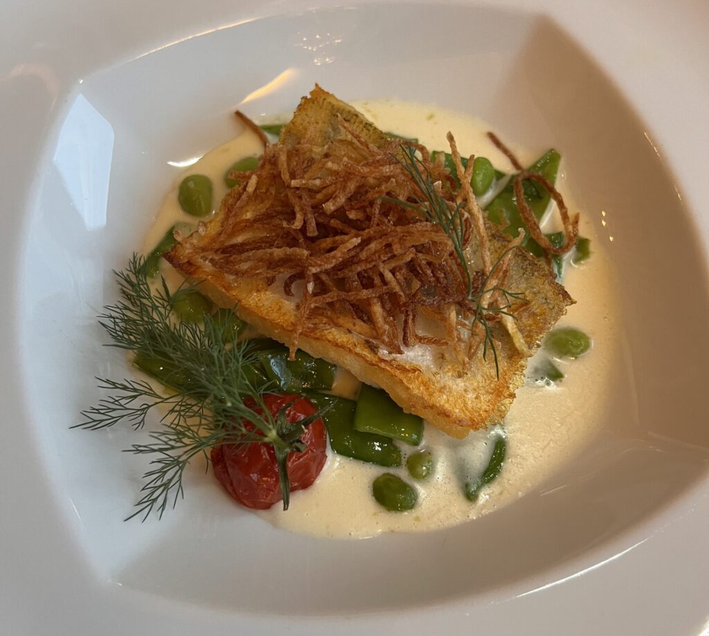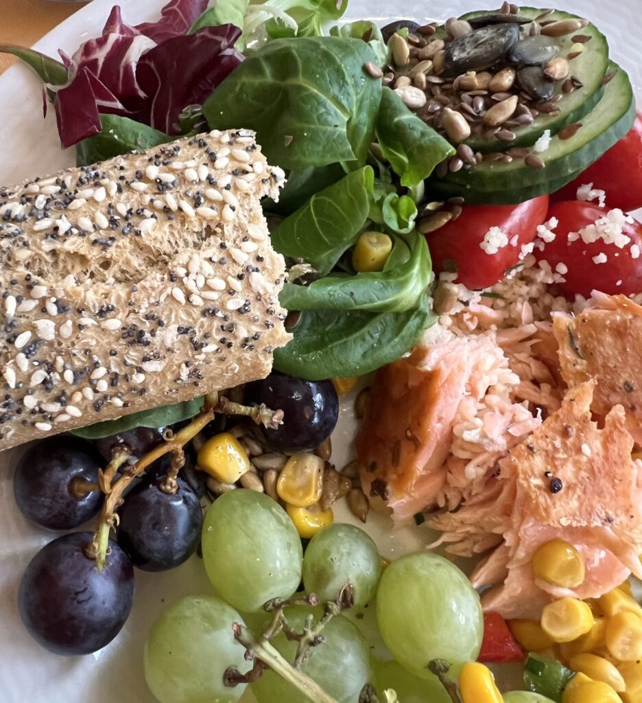 Måndagens middag var Salladsbuffé, Pea soup, Fried pikeperch fillet with crispy poatatoes, Ostbuffé och Blueberry shortcrust pastery slice with ice cream.