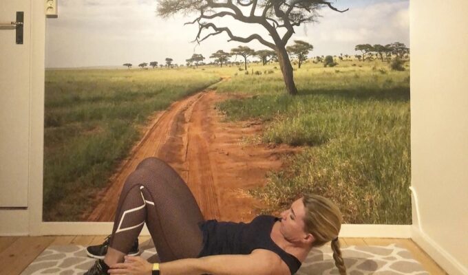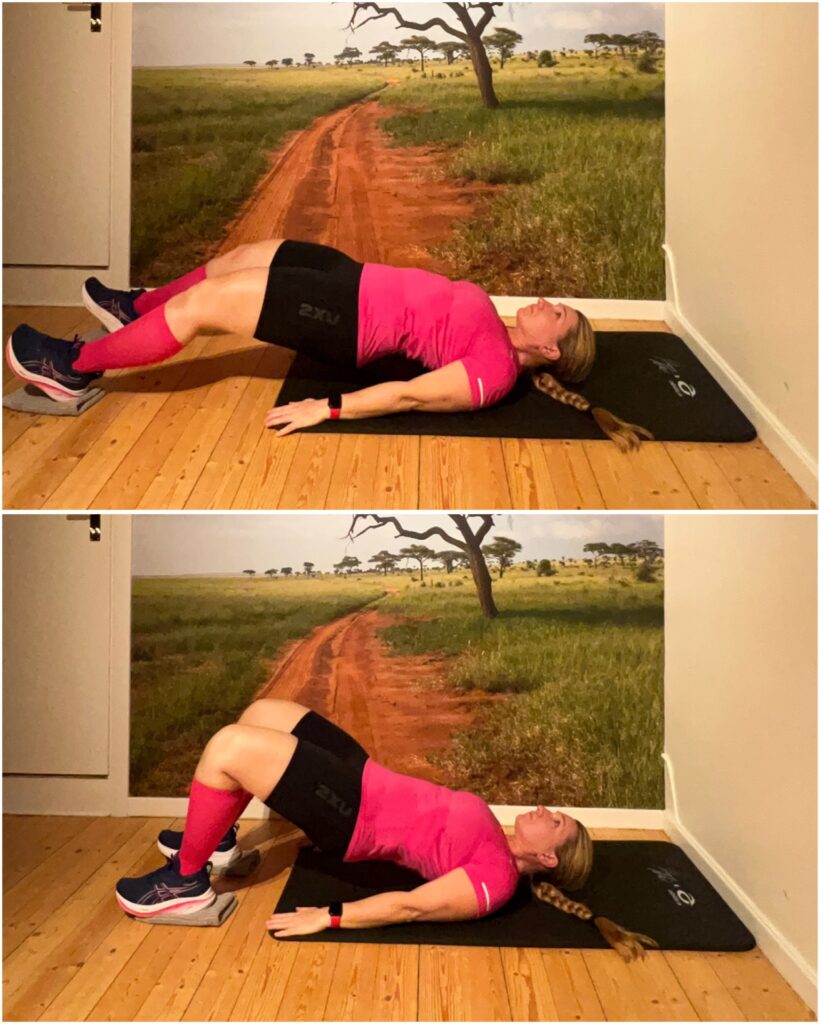 Ligg på rygg med raka ben och med något som kan glida bra under fötterna. Jag använde två små handdukar. Ett par raggsockor funkar också bra. Tryck upp höften mot taket och dra in fötterna mot rumpan. Dra tillbaka dem till startposition. Fortsätt utan att sänka ner kroppen till golvet. En grymt bra övning för baksida lår. Det är lika viktigt att träna baksida lår som framsida lår (ex benböj).