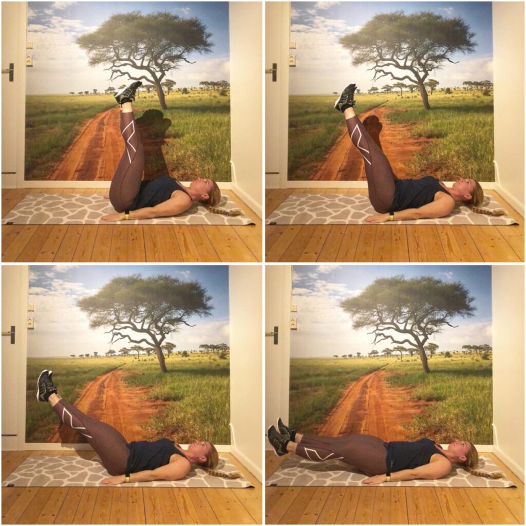 Nedan benlyft. Ligg på rygg. Tryck ner svanken i golvet genom hela övningen. Lyft benen tills de är rakt upp (90 grader i höften). Sänk sakta benen mot golvet, håll emot med magen. Stanna precis innan du nuddar golvet. Lyft upp benen igen till 90 grader.