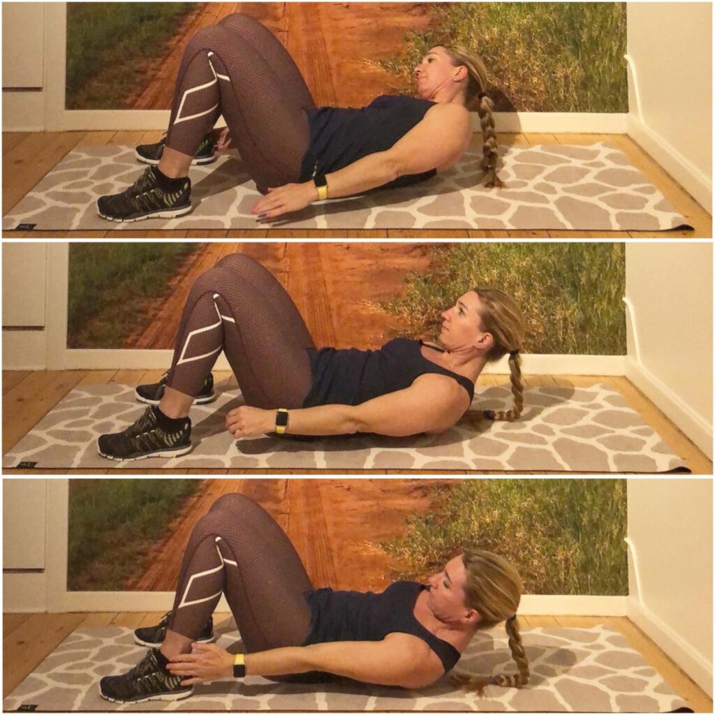 Nedan hältouch. Ligg på rygg med fotsulorna i golvet. Lyft upp huvud och axlar från golvet med hjälp av magen. För höger hand mot höger häl, sedan direkt vänster hand mot vänster häl. Ha hela tiden övre överkroppen ovanför golvet. Magen är spänd genom hela övningen.